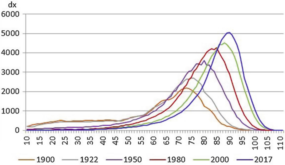 And this is (2) roughly how total mortality is distributed in humans. This is how life expectancy "increased"!! starting from 1900 - in "every age - slightly to the right"!! More and more people live a little longer. Not very many early deaths - but they exist too. Main mortality - around "average life expectancy" (although the spread here is from 65 to 95 years - that is 30 years!! And why someone lives to 65, and someone to 95 - we have no answer! Although there are many myths - explanations when someone dies))) "Drank, smoked, was nervous, heart problems, didn't exercise" and many other things... But the truth is probably completely different!!)